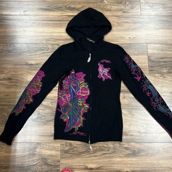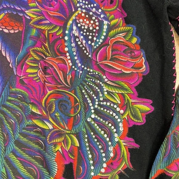 Oh. My. God. This sweater (truly a sweater, not fleece since many people call sweatshirts sweaters for sone really strange reason) is amazing and a very sight after peacock design. The body itself looks brand new. Considering where it came from, it probably is. Last pic shows the very slightest discoloration but it just looks like dust from scraping wall. There is no fading, pilling, snags, etc. Pristine condition. There are a few missing crystals in back but random placement so very inconspicuous. It is not in need of repair but you can easily replace if you do choose.This is on display in my shop and I don’t expect it to sit around for very long.Check out my other listings! Chances are if you see something you like, there will be more similar size and style.All items sold here are available for purchase in my brick & mortar boutique. I buy wholesale just like any normal boutique AND I consign items (that means I am selling for other people for a commission). Therefore, there are minimums I can sell for, and most money goes to the owner while the rest pays my rent and business expenses and employees. Please keep that in mind when making offers and do not low ball.Most items have some wiggle room but if there is not, that will be specified. Also, know that an item can be sold in my shop at anytime, so if you want it, don’t wait around! 🙂Photo of tag is just to be sure we match up correct item with a sale. Owner/SKU/Location: AT99697