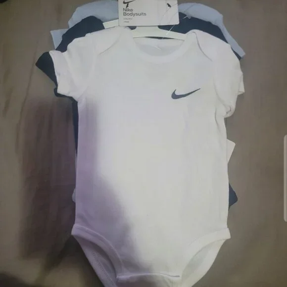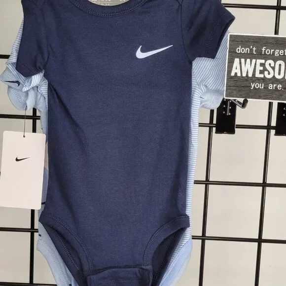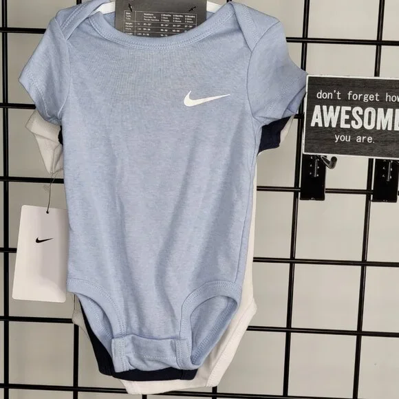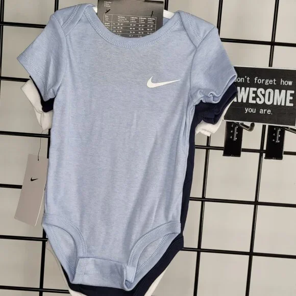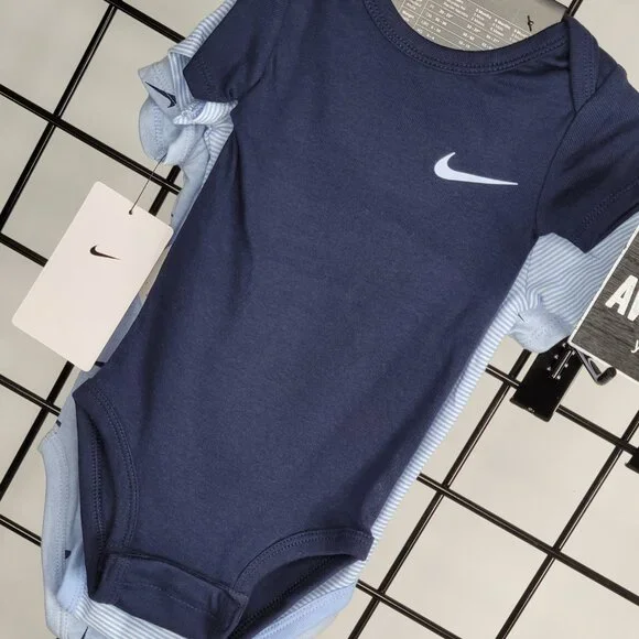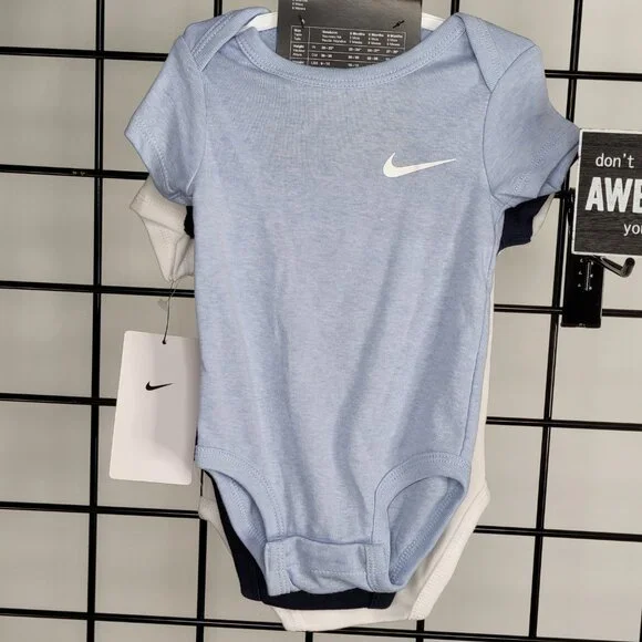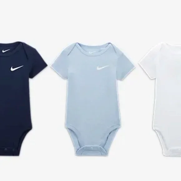 Dress your little one in effortless style with this Nike Baby 3-Pack Bodysuit Set, featuring classic navy, light blue, and white colorways. Each bodysuit is made from soft, breathable fabric, ensuring your baby stays comfortable all day long. The iconic Nike swoosh is front and center, adding a sporty touch to these everyday essentials.With convenient snap-button closures for easy diaper changes, these bodysuits are designed for both comfort and practicality. Whether for playtime, naptime, or casual outings, this set is perfect for layering or wearing solo for a clean, classic look.💫 Key Features:Includes three bodysuits in navy, light blue, and whiteSoft, breathable fabric for all-day comfortFeatures the iconic Nike swoosh on each bodysuitSnap closures for quick and easy diaper changesPerfect for everyday wear, lounging, or playtime🌟 Tags: #BabyEssentials #ComfortAndStyle #SportyBaby #EverydayWear #NikeSwoosh