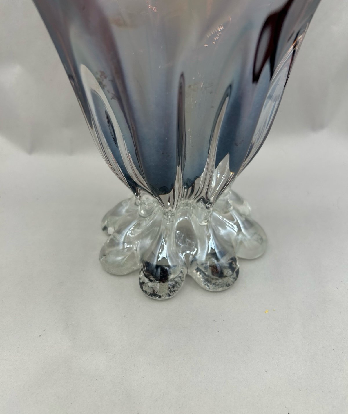 Vintage Purple Iridiscent Finish 8 Finger Pulled Abstract Rim Art Glass Vase 8”. Exterior has an iridescent finish. Approx. 8” tall, 8” wide at the mouth, and 4” wide at the base. This is a heavy piece of glass. No apparent chips or cracks. Some light marks/scratches as common in vintage glass. Please see all photos as part of item description.
